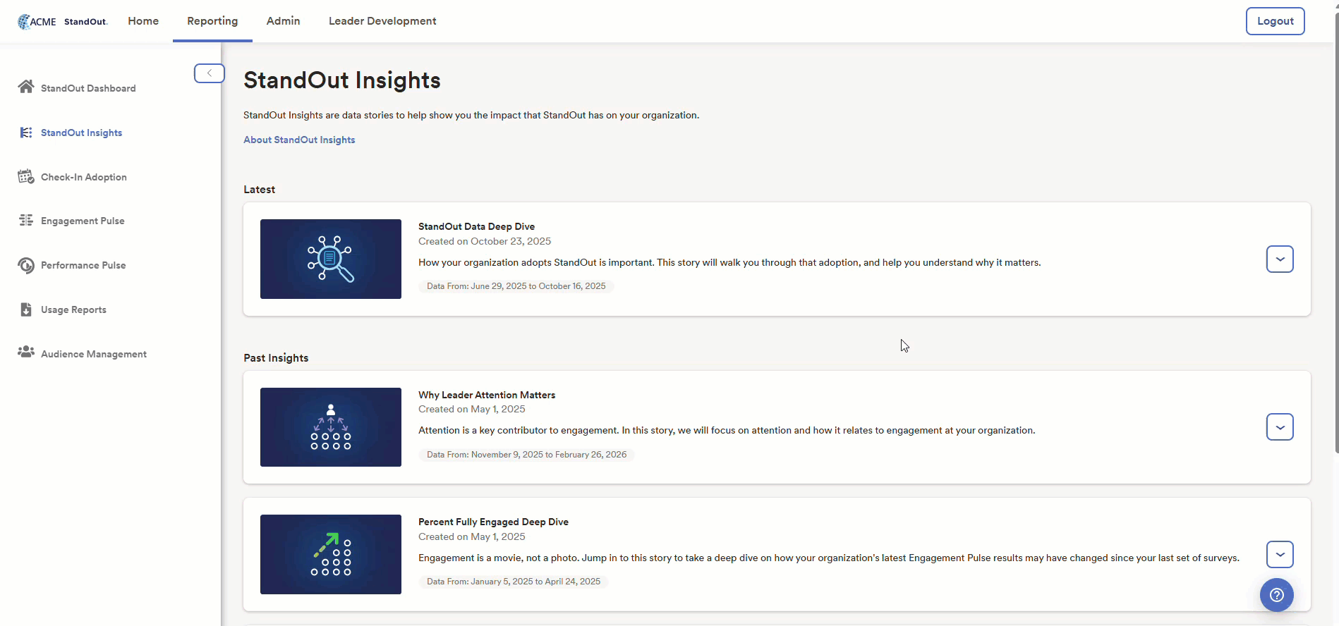 The StandOut Data Deep Dive story can be found in StandOut Reporting → StandOut Insights, and practitioners will also receive an in-platform notification and email each time a new story is generated. There’s a shareable link at the top of the story, through which practitioners may easily send the story to anyone else in the organization as long as they have an active StandOut account. As with all other StandOut Insights Stories, all charts are easily exportable from the slides and PDF views are available as well.